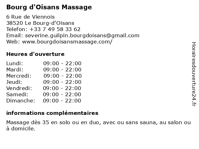 1 Physioski - Cabinet de Massage (Distance: 4,89 km) - Les Hauts Lieux, 38750 Alpe d'Huez alpe d'huez, cabinet, de, massage, osthéopathes, physioski 2 Ahimsa - Le Spa (Distance: 5,54 km) 315 route de l'Altiport, 38750 Huez ahimsa, corps, détente, le, massage, soins, spa 3 Le Tournesols des Alpes (Distance: 26,06 km) 32 Chemin de Berivière, 38240 Meylan alpes, des, hypno à meylan, le, massage, psycho, sophro, tournesols 4 Un Moment pour Soi (Distance: 28,16 km) 43 cours de la Libération, 38100 Grenoble beauté, de, esthétique, institut, massage, moment, pour, soi, un 5 Sabaï Massage (Distance: 28,44 km) 29 Rue Condorcet, 38000 Grenoble massage, massages, relaxation, sabaï, santé, thérapies 6 Massage Energy Training (Distance: 28,53 km) 8 Rue du Dr Mazet, 38000 Grenoble energy, massage, massages, relaxation, santé, thérapies, training |