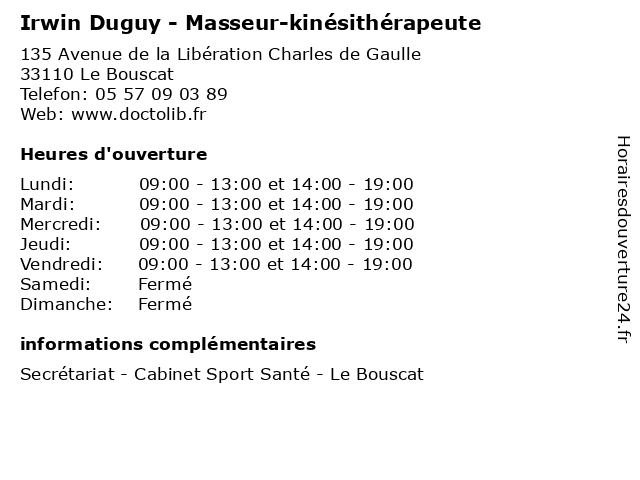 | Jeudi | 09:00-13:00 et 14:00-19:00 |