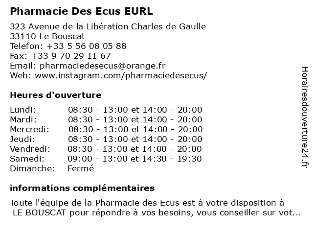 | Lundi | 08:30-13:00 et 14:00-20:00 |