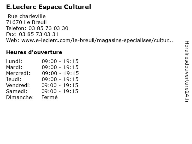 1 E.Leclerc Espace culturel (Distance: 0,46 km) . Rue Charleville, 71670 Le Breuil culturel, e.leclerc, espace, service, services, services a la personne 2 E.Leclerc Espace Culturel (Distance: 15,88 km) Avenue du marechal leclerc, 71300 Montceau Les Mines culturel, e.leclerc, espace, fournisseur de matériel audiovisuel, librairies, magasin de jeux vidéo, magasin de musique, matériel de photographie, matériel vidéo, services et matériel vidéo 3 E.Leclerc Parapharmacie (Distance: 0,02 km) 2 Avenue de chambreuil, 71670 Le Breuil de soins capillaires, e.leclerc, magasin de, parapharmacie, produits 4 E.Leclerc Voyages (Distance: 0,12 km) 2 Avenue De Chambreuil, 71670 Le Breuil e.leclerc, séjours, séjours vacances, voyages 5 E.Leclerc Le Breuil (Distance: 0,12 km) 2 Avenue de Chambreuil, 71670 Le Breuil breuil, e.leclerc, le, service, services, services a la personne 6 E.Leclerc Une heure pour soi (Distance: 0,28 km) . Rue Charleville, 71670 Le Breuil e.leclerc, heure, pour, service, services, services a la personne, soi, une |