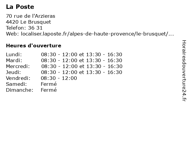 1 La Poste (Distance: 3,21 km) - Route Nationale 100, 04420 La Javie agence, colis, courriers, expédition, la, postale, poste, relais 4 La Poste (Distance: 10,23 km) 4 Rue André Honnorat, 04000 Digne-les-Bains agence, assurance, banque, banque postale, bureau de poste, chronopost, colis, courrier, dps, expéditions internationales, la, point, postale, poste, relais, timbres, téléphonie, ups, western union 5 La Poste (Distance: 11,69 km) - Route Départementale 900A, 04140 Barles agence, assurance, banque, banque postale, bureau de poste, chronopost, colis, courrier, dps, expéditions internationales, la, point, postale, poste, relais, timbres, téléphonie, ups, western union 6 La Poste (Distance: 13,19 km) - Le Serre, 04380 Thoard agence, assurance, banque, banque postale, bureau de poste, chronopost, colis, courrier, dps, expéditions internationales, la, point, postale, poste, relais, timbres, téléphonie, ups, western union |