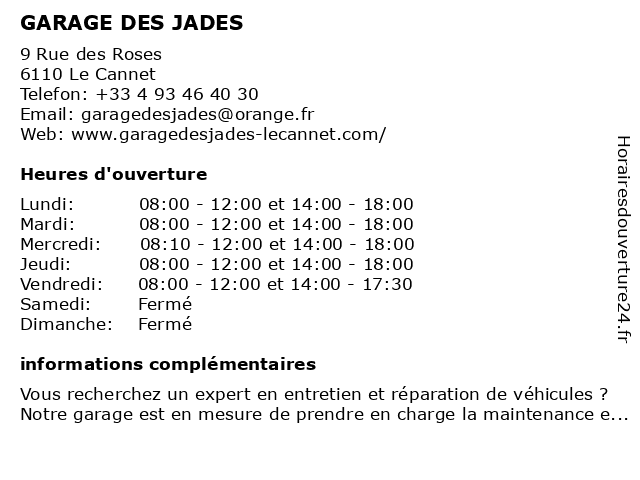 | Lundi | 08:00-12:00 et 14:00-18:00 |