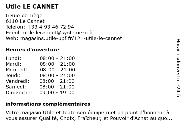 4 M.A. Formation Utile (Distance: 6,45 km) avenue Quiera Lot 75 Av De La Quiera, 06370 Mouans sartoux formation, m.a., utile 5 Utile Supermarché (Distance: 7,16 km) 114 Boulevard Raymond Poincaré, 06160 Juan-les-Pins alimentation, supermarché, supérette, utile, épicerie 6 |
