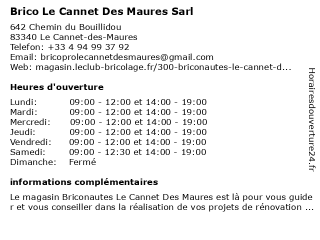 1 E.Leclerc Brico (Distance: 3,12 km) Route de toulon, 83340 Le Luc brico, e.leclerc, fabricant d'abris de jardin, fabricant de garages, fournisseur de bois de chauffage, magasin de fournitures pour piscines, nettoyage de fosses septiques, plantes d?intérieur, système d?arrosage de la pelouse, vente de tondeuses à gazon 2 E.Leclerc Brico (Distance: 5,07 km) . Route De Toulon, 83340 Le Luc brico, e.leclerc, service, services, services a la personne 3 Brico Leclerc (Distance: 5,07 km) Route de Toulon Quartier la Retrache, 83340 Le Luc brico, bricolage, leclerc, magasin, outillage, outils 4 BRICO CARCES (Distance: 15,29 km) 9 Rue Maréchal Foch, 83570 Carcès brico, bricolage, carces, climatisation, dépannage, fourniture bricolage, location, matériel, plomberie, pose, rénovation, électricité 5 Planet'Brico (Distance: 27,07 km) 15 Chemin des Prés, 83630 Aups aupsois, brico, bricolage, magasins, papiers, peints, peintures, planet, planet'brico, verre 6 E.Leclerc Brico (Distance: 36,32 km) 667 Route des Loubes, 83400 Hyeres brico, e.leclerc, service, services, services a la personne |