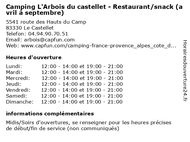 Termes de recherche pour Camping L'Arbois du castellet - Restaurant/snack (avril à septembre):du, hebergement, camping, tourisme, septembre, avril, castellet, restaurant/snack, l'arbois |