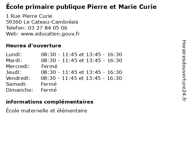 1 École Maternelle Publique Groupe Scolaire Jean Zay - Marie Curie (Distance: 10,15 km) . Rue Georges Bizet, 59730 Solesmes cours, curie, education, groupe, jean, marie, maternelle, publique, scolaire, services, zay, école 2 École Primaire Publique Joliot-Curie (Distance: 13,83 km) 9 Rue du Général de Gaulle, 59292 Saint-Hilaire-lez-Cambrai cours, curie, education, joliot, primaire, publique, services, école 3 École primaire publique Joliot Curie (Distance: 16,46 km) 42 Passage Largillière, 59129 Avesnes-les-Aubert cours, curie, education, joliot, primaire, publique, services, école 4 École primaire publique Marie Curie (Distance: 17,73 km) 8 Rue Jules Guesde, 59188 Villers-en-Cauchies cours, curie, education, marie, primaire, publique, services, école 5 École élémentaire publique Duruy-Joliot Curie (Distance: 22,01 km) . Rue Du Marechal Foch, 59141 Iwuy cours, curie, duruy, joliot, publique, services, école, élémentaire 6 École élémentaire publique Joliot-Curie (Distance: 24,38 km) 94 Rue Roger Salengro, 59300 Famars cours, curie, joliot, publique, servicios, école, élémentaire |