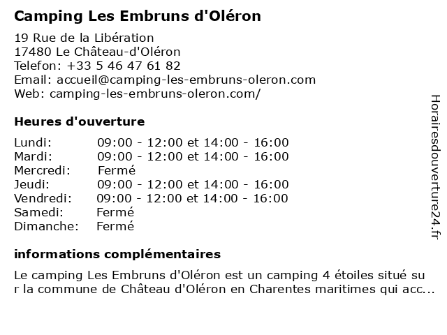 1 Camping Le Maine (Distance: 3,25 km) 24 Route du Maine, 17370 Le Grand-Village-Plage camping, le, maine 2 Camping Paradis La Cailletière (Distance: 5,25 km) Route de Boyardville, 17550 Dolus-d'Oléron cailletière, camping, la, paradis 3 Camping Le Montet d'Oleron (Distance: 5,41 km) 671 route du Treuil, 17550 Dolus-d'Oléron camping, d'oleron, emplacement, hébergement, le, montet, restauration, réservations 4 Camping St-tro'park (Distance: 5,91 km) 36 Avenue des Bris, 17370 Saint-Trojan-les-Bains camping, st, tro'park 5 Camping La Brande - Réception Juillet et Août (Distance: 6,56 km) - Route des Huîtres, 17480 Le Château-d’Oléron août, brande, camping, en, et, juillet, la, loisirs, réception, tourisme, vacances 6 Camping La Brande - Réception Hors Saison (Distance: 6,56 km) - Route des Huîtres, 17480 Le Château-d’Oléron brande, camping, hors, la, loisirs, réception, saison, tourisme, vacances |