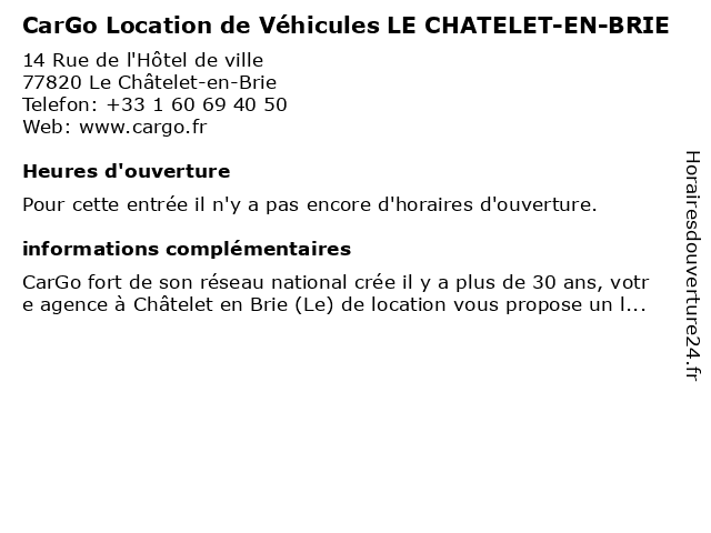 | Appeler CarGo Location de Véhicules LE CHATELET-EN-BRIE | |