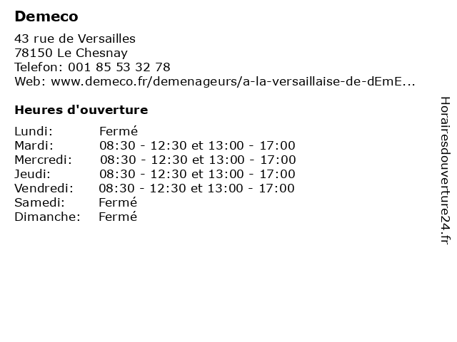 1 Demeco - Quali Dem (Distance: 12,93 km) 3 rue de l'Amiral Roussin, 75015 Paris cartons, dem, demeco, déménagement, meubles, quali, transport 2 Demeco - Challenge (Distance: 14,64 km) 61 rue Jean Jaurès, 92300 Levallois-Perret cartons, challenge, demeco, demenageur, déménagement, meubles, transport 3 DEMECO CHALLENGE DÉMÉNAGEMENTS AGENT (Distance: 14,64 km) 61 Rue Jean Jaurès, 92300 Levallois-Perret agent, challenge, demeco, déménagements 5 Demeco - Seegmuller (Distance: 15,03 km) 218 boulevard Raspail, 75014 Paris cartons, demeco, déménagement, meubles, seegmuller, transport 6 Seegmuller Demeco (Distance: 15,30 km) 62 Boulevard Malesherbes, 75008 Paris demeco, déménagements, déménageur, rangement, seegmuller, services  |