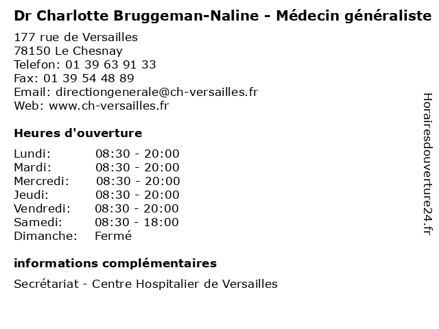 1 Charlotte Pailleau - Sage-femme (Distance: 0,00 km) 177 rue de Versailles, 78150 Le Chesnay charlotte, consultation, docteur, dr, femme, med, médecin, pailleau, sage, traitement 2 Dr Charlotte Colin - Pneumologue (Distance: 0,00 km) 177 rue de Versailles, 78150 Le Chesnay charlotte, colin, consultation, docteur, dr, med, médecin, pneumologue, traitement 3 Maître Charlotte Deschamps - Avocate (Distance: 1,44 km) 27 rue de Versailles, 78150 Versailles avocate, avocats, charlotte, civils, deschamps, droits, juridiques, maître 4 Maître Charlotte Chevallier - Avocate (Distance: 1,98 km) 27 Rue Exelmans, 78000 Versailles avocate, avocats, charlotte, chevallier, civils, droits, juridiques, maître 5 Dr Charlotte De Courteix - Médecin généraliste - secrétariat (Distance: 3,60 km) 9 Rue de Limoges, 78000 Versailles charlotte, consultation, courteix, de, docteur, dr, généraliste, med, médecin, médecine, secrétariat, traitement 6 Dr. Charlotte Lecompte - Dentiste (Distance: 6,61 km) 4 Rue Racine, 92500 Rueil-Malmaison charlotte, dentiste, docteur, dr., lecompte, medecins, sante |