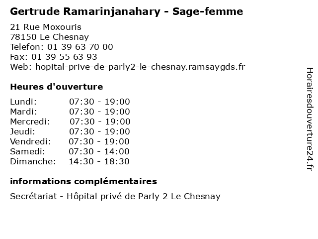 1 Café Le Petit Pont (Distance: 16,80 km) 1 Rue du Petit Pont, 75005 Paris brasserie, café, gertrude, le, petit, pont, repas, restaurants 2 Begarin Romain Evelyne Gertrude (Distance: 20,35 km) 90 Rue De Menilmontant, 75020 Paris begarin, evelyne, gertrude, restaurants, romain 3 Frédérique Chambert-Loir - Sage-femme (Distance: 0,00 km) 21 Rue Moxouris, 78150 Le Chesnay chambert, consultation, docteur, femme, frederique, frédérique, loir, med, médecin, sage, traitement 4 Agnès Couteret - Sage-femme (Distance: 0,00 km) 21 Rue Moxouris, 78150 Le Chesnay agnes, agnès, consultation, couteret, docteur, femme, med, médecin, sage, traitement 5 Isabelle Diagne - Sage-femme (Distance: 0,00 km) 21 Rue Moxouris, 78150 Le Chesnay consultation, diagne, docteur, femme, isabelle, med, médecin, sage, traitement 6 Church's (Distance: 0,24 km) . avenue Charles de Gaulle, 78150 Le Chesnay accessoires, church's, femme, homme, magasin, mode |