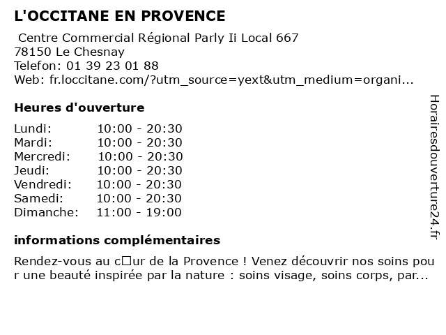 1 L'OCCITANE EN PROVENCE (Distance: 2,38 km) 39 Rue De La Paroisse, 78000 Versailles boutique de cadeaux, drugstores, en, l'occitane, provence 2 L'OCCITANE EN PROVENCE (Distance: 7,20 km) 19 Rue Hervet, 92500 Rueil-Malmaison boutique de cadeaux, drugstores, en, l'occitane, provence 3 L'OCCITANE EN PROVENCE (Distance: 8,01 km) 3-5-7 Rue Des Louviers, 78100 Saint Germain En Laye boutique de cadeaux, drugstores, en, l'occitane, provence 4 L'OCCITANE EN PROVENCE (Distance: 9,18 km) 93 Bd Jean Jaurès, 92100 Boulogne Billancourt boutique de cadeaux, drugstores, en, l'occitane, provence 5 L'OCCITANE EN PROVENCE (Distance: 9,18 km) 2 Avenue De L'europe, 78140 Velizy boutique de cadeaux, drugstores, en, l'occitane, provence 6 L'OCCITANE EN PROVENCE (Distance: 11,32 km) Centre Commercial Les Quatre Temps Niveau 1, 92800 Puteaux boutique de cadeaux, drugstores, en, l'occitane, provence |