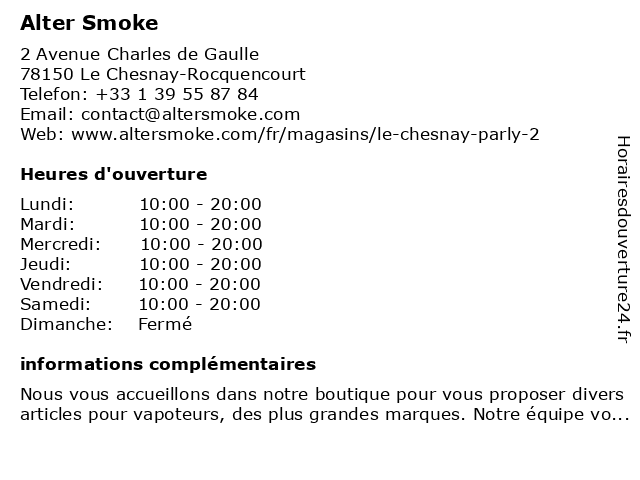 2 Alter Smoke (Distance: 10,67 km) 194 avenue de Versailles, 75016 Paris alter, cigarette, cigarettes, e-liquide, electroniques, smoke, vapotage, vapote, vapoteur, électronique 3 Alter Smoke (Distance: 13,08 km) 44 avenue Charles de Gaulle, 92200 Neuilly Sur Seine alter, cigarette, cigarettes, e-liquide, electroniques, smoke, vapotage, vapote, vapoteur, électronique 4 Alter Smoke (Distance: 14,45 km) 2 Rue De Washington, 75008 Paris alter, altersmoke, business, champs, elysées, paris, shop, smoke, vape 5 Alter Smoke (Distance: 15,47 km) 28 rue Miromesnil, 75008 Paris alter, cigarette, cigarettes, e-liquide, electroniques, smoke, vapotage, vapote, vapoteur, électronique 6 |