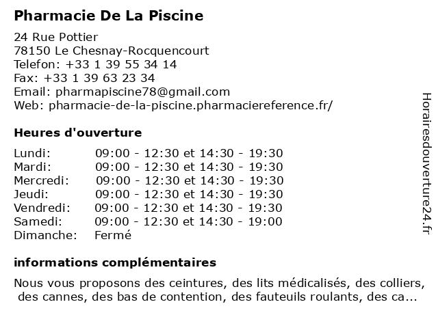 1 Pharmacie de la Piscine (Distance: 17,60 km) 92 Rue Youri Gagarine, 94800 Villejuif de, herboristerie, la, médicaments, paramédical, parapharmacie, pharmacie, pharmacien, piscine, santé, traitements 2 Piscine Corneille (horaires d’été) (Distance: 2,27 km) 20A avenue Corneille, 78170 La Celle Saint-Cloud corneille, d’été, horaires, piscine, récréative 3 Piscine Montbauron - Bassin Loisirs (Périodes Scolaires) (Distance: 2,67 km) 7 rue Léon Gatin, 78000 Versailles bassin, loisirs, montbauron, piscine, périodes, récréative, scolaires 4 Piscine Municipale (Périodes Scolaires) (Distance: 5,67 km) 5 rue Paul Leplat, 78160 Marly-le-Roi bassins, espace, fitness, franck, municipale, piscine, périodes, récréative, scolaires, scolaires/, vacances 5 Piscine Intercommunale (Petites Vacances scolaires) (Distance: 8,84 km) s/n Avenue des Loges, 78100 Saint-Germain-en-Laye intercommunale, olympique, petites, piscine, récréative, scolaires, vacances 6 Piscine municipale Guy Bey - piscine (Périodes scolaires) (Distance: 8,89 km) 23 rue Charles Infroit, 92190 Meudon aqua, aquatique, bey, guy, municipale, piscine, périodes, scolaires |