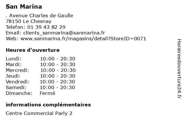 1 San Marina (Distance: 10,27 km) 1 Rue du président Kennedy, 78340 Les Clayes-sous-Bois accessoires femme, chaussures, enfant, homme, marina, san, san marina 2 San Marina (Distance: 11,76 km) 91 Rue de Passy, 75016 Paris accessoires femme, chaussures, enfant, homme, marina, san, san marina 3 San Marina (Distance: 12,81 km) . Place du 11 novembre 1918, 75010 Paris cafe, chaussures, enfants, homme, lingerie, marina, mode femme, restaurant, san, service, shopping 4 San Marina (Distance: 15,27 km) 30 Avenue du General Leclerc, 75014 Paris accessoires femme, chaussures, enfant, homme, marina, san, san marina 5 San Marina (Distance: 16,54 km) 1 Boulevard St Michel, 75005 Paris accessoires femme, chaussures, enfant, homme, marina, san, san marina 6 San Marina (Distance: 16,56 km) 101 Porte Berger, 75045 Paris chaussures, lingerie, marina, mode enfant, mode femmes, mode hemmes, san, sport |