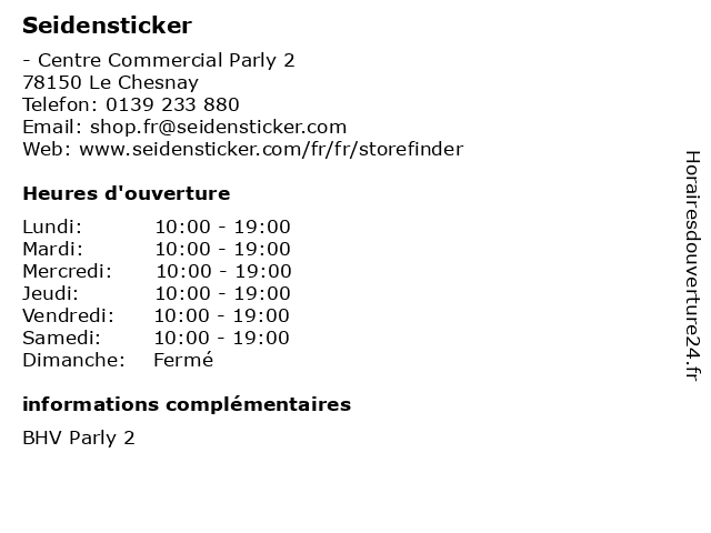 1 Seidensticker (Distance: 15,64 km) 1 Place Michel Debre, 75006 Paris accessoires, boutique, mode, prêt à porter, sacs, seidensticker, vêtements 2 Seidensticker (Distance: 16,08 km) 52 Rue de Rivoli, 75004 Paris hommes, mode, prêt à porter, seidensticker, vêtements 3 Seidensticker (Distance: 16,43 km) 40 Boulevard Haussmann, 75009 Paris hommes, mode, prêt à porter, seidensticker, vêtements 4 Seidensticker (Distance: 26,83 km) - Avenue du Général de Gaulle, 93117 Rosny Sous Bois hommes, mode, prêt à porter, seidensticker, vêtements 5 Seidensticker (Distance: 39,48 km) 3 Allee du Preambule, 77127 Lieusaint hommes, mode, prêt à porter, seidensticker, vêtements 6 Eden Park (Distance: 0,00 km) n/a Centre Commercial Parly 2, 78150 Le Chesnay accessoires, eden, femme, homme, mode, park, vêtements |