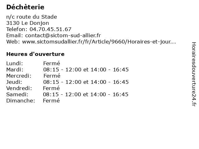 | 1 Déchèterie (Distance: 16,27 km) - lieu-dit L'Opéra, 03220 Thionne bennes, déchets, déchèterie, détritus, gravats 2 Déchèterie (Distance: 19,96 km) - Route de Sept Fons, 03290 Dompierre-sur-Besbre bennes, déchets, déchèterie, détritus, gravats 3 Déchèterie (Hiver) (Distance: 16,92 km) - lieu-dit Les Jeanrais, 03120 Saint-Prix bennes, débarras, déchèterie, détritus, hiver, mars, octobre, ordures, poubelles 4 Déchèterie (Eté) (Distance: 16,92 km) - lieu-dit Les Jeanrais, 03120 Saint-Prix avril, bennes, débarras, déchèterie, détritus, eté, ordures, poubelles, septembre 5 Déchèterie Municipale (Distance: 23,42 km) - Lieu-dit La Haute Brosse, 71340 Melay cartons, dechets verts, déchèterie, gravats, huiles usées, municipale, papiers 6 Veolia (Distance: 31,51 km) - ZAC des Ancises, 03300 Creuzier le Neuf bois, carton, creuzier, decheterie, dechets, encombrants, ferraille, gravats, le, neuf, plastique, veolia, végétaux |