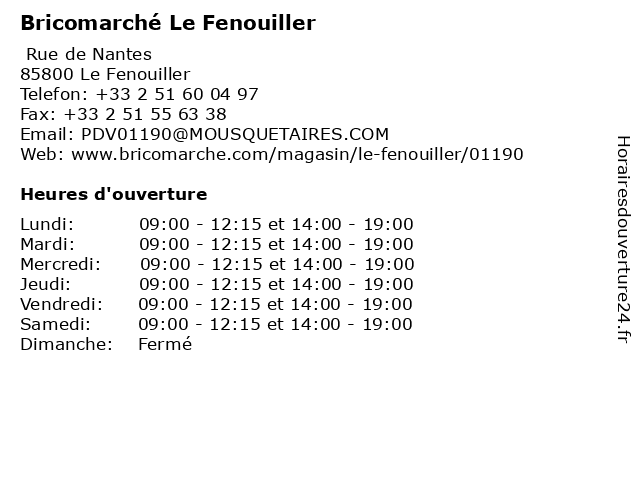 2 3 Bricomarché Saint-Philbert-De-Grand-Lieu (Distance: 44,75 km) Le Moulin de la Chaussée, 44310 Saint-Philbert-de-Grand-Lieu bricomarché, de, grand, lieu, philbert, saint 4 Bricomarché Pornic (Distance: 47,11 km) Zone d'activité les Gentelleries, 44210 Pornic bricomarché, pornic |
