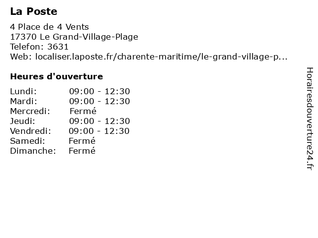 1 La Poste (Distance: 0,07 km) 4 Place des Quatre Vents, 17370 Le Grand-Village-Plage agence postale, courrier postal, expédition internationale, la, poste 2 La Poste (Distance: 7,22 km) - Place Henri Barbusse, 17560 Bourcefranc-le-Chapus agence postale, courrier postal, expédition internationale, la, poste 3 La Poste (Distance: 11,81 km) 58 Avenue des albatros, 17190 St georges d'oleron la, la poste, poste, st georges d'oleron 4 La Poste (Distance: 12,09 km) 5 Avenue du Général de Gaulle, 17390 La Tremblade agence postale, courrier postal, expédition internationale, la, poste 5 La Poste (Distance: 16,05 km) 1 Place du Marché, 17530 Arvert agence postale, courrier postal, expédition internationale, la, poste 6 La Poste (Distance: 17,02 km) 1 Place Eugène Papin, 17320 Saint-Just-Luzac agence postale, courrier postal, expédition internationale, la, poste |