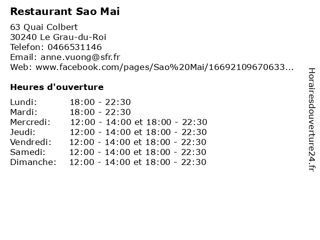 | Samedi | 12:00-14:00 et 18:00-22:30 |