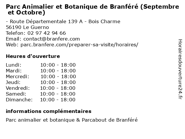 1 Le Parcabout (Septembre et Octobre) (Distance: 0,00 km) - Route Départementale 139 A - Bois Charme, 56190 Le Guerno accrobranches, attractions, branféré, et, le, loisirs, octobre, parc, parcabout, septembre 2 Parc Animalier et Botanique de Branféré (Juillet et Août) (Distance: 0,00 km) - Route Départementale 139 A - Bois Charme, 56190 Le Guerno 31, animalier, animaux, août, attractions, au, botanique, branféré, de, et, juillet, loisirs, parc, zoo, zoologique 3 Parc Animalier et Botanique de Branféré (Avril à Juin) (Distance: 0,00 km) - Route Départementale 139 A - Bois Charme, 56190 Le Guerno animalier, animaux, attractions, au, avril, botanique, branféré, de, et, juillet, juin, loisirs, parc, zoo, zoologique 4 Parc Animalier et Botanique de Branféré (Février et Mars) (Distance: 0,00 km) - Route Départementale 139 A - Bois Charme, 56190 Le Guerno animalier, animaux, attractions, au, avril, botanique, branféré, de, et, février, loisirs, mars, parc, zoo, zoologique 5 Camping Le Bedume - Février à avril - Octobre et novembre (Distance: 10,72 km) 40 rue du Bedume, 56190 Ambon avril, bedume, camping, et, février, le, loisirs, mars, novembre, octobre, réception, tourisme, vacances 6 Au Fil des Fleurs - septembre à juin (Distance: 13,11 km) 289 boulevard de l'Océan, 56760 Pénestin au, bouquets, des, fil, fleuriste, fleurs, florale, juin, septembre |