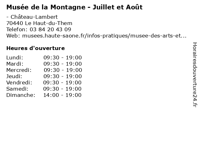 1 Musée de la Montagne - Févirer à Mars et Octobre à Novembre (Distance: 0,00 km) - Château-Lambert, 70440 Le Haut-du-Them 1er, 30, 31, au, de, et, exposition, févirer, février, la, mars, montagne, musée, novembre, octobre, visite 2 Musée de la Montagne - Avril/Juin/Septembre (Distance: 0,00 km) - Château-Lambert, 70440 Le Haut-du-Them 1er, 30, au, avril, avril/juin/septembre, de, exposition, juin, la, montagne, musée, septembre, visite 3 Montagne Saveurs du Terroir (Distance: 5,31 km) 44 Avenue de Verdun, 88160 Le Thillot du, montagne, saveurs, terroir 5 Sport 2000 Montagne (Distance: 10,71 km) - Chalets, 73700 La Rosiere 2000, course à pied, mode, montagne, multisport, sport 6 Auberge la Montagne (Distance: 14,47 km) - Le Mont Du Tronc, 70280 Saint-Bresson auberge, bar, bistro, bistrot, brasserie, café, la, montagne, pub, restaurant, restauration, resto |