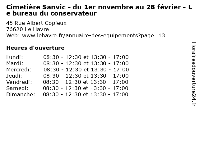 1 Cimetière Sanvic - du 1er novembre au 28 février (Distance: 0,00 km) 45 Rue Albert Copieux, 76620 Le Havre 1er, 28, arbre, au, cimetiere, cimetière, du, espace vert, forêt, funeraire, février, jardin, loisirs, nature, novembre, parc, prairie, sanvic, square 2 Cimetière de Bléville - du 1er novembre au 28 février (Distance: 1,46 km) - Rue Maryse Bastié, 76620 Le Havre 1er, 28, arbre, au, bléville, cimetiere, cimetière, de, du, espace vert, forêt, funeraire, février, jardin, loisirs, nature, novembre, parc, prairie, square 3 Cimetière Sainte-Marie - du 1er novembre au 28 février (Distance: 2,47 km) 2 Rue Eugène Landoas, 76620 Le Havre 1er, 28, arbre, au, cimetiere, cimetière, du, espace vert, forêt, funeraire, février, jardin, loisirs, marie, nature, novembre, parc, prairie, sainte, square 4 Cimetière Nord - du 1er novembre au 28 février (Distance: 2,84 km) 76 Rue des Sports, 76620 Le Havre 1er, 28, arbre, au, cimetiere, cimetière, du, espace vert, forêt, funeraire, février, jardin, loisirs, nature, nord, novembre, parc, prairie, square 5 Cimetière de l'abbaye de Graville - du 1er novembre au 28 février (Distance: 5,40 km) 53 Rue de l'Abbaye, 76600 Le Havre 1er, 28, arbre, au, cimetiere, cimetière, de, du, espace vert, forêt, funeraire, février, graville, jardin, l'abbaye, loisirs, nature, novembre, parc, prairie 6 Cimetière de l'abbaye de Graville - du 1er novembre au 28 février - Le bureau du conservateur (Distance: 5,40 km) 53 Rue de l'Abbaye, 76600 Le Havre 1er, 28, arbre, au, bureau, cimetiere, cimetière, conservateur, de, du, espace vert, forêt, funeraire, février, graville, jardin, l'abbaye, le, loisirs, novembre |