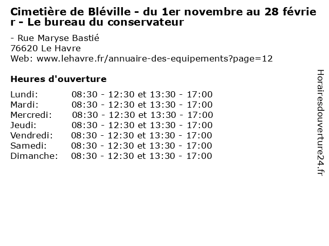 1 Cimetière de Bléville - du 1er novembre au 28 février (Distance: 0,00 km) - Rue Maryse Bastié, 76620 Le Havre 1er, 28, arbre, au, bléville, cimetiere, cimetière, de, du, espace vert, forêt, funeraire, février, jardin, loisirs, nature, novembre, parc, prairie, square 2 Cimetière Sanvic - du 1er novembre au 28 février (Distance: 1,46 km) 45 Rue Albert Copieux, 76620 Le Havre 1er, 28, arbre, au, cimetiere, cimetière, du, espace vert, forêt, funeraire, février, jardin, loisirs, nature, novembre, parc, prairie, sanvic, square 3 Cimetière Nord - du 1er novembre au 28 février (Distance: 2,54 km) 76 Rue des Sports, 76620 Le Havre 1er, 28, arbre, au, cimetiere, cimetière, du, espace vert, forêt, funeraire, février, jardin, loisirs, nature, nord, novembre, parc, prairie, square 4 Cimetière Sainte-Marie - du 1er novembre au 28 février (Distance: 2,78 km) 2 Rue Eugène Landoas, 76620 Le Havre 1er, 28, arbre, au, cimetiere, cimetière, du, espace vert, forêt, funeraire, février, jardin, loisirs, marie, nature, novembre, parc, prairie, sainte, square 5 Cimetière de l'abbaye de Graville - du 1er novembre au 28 février (Distance: 5,43 km) 53 Rue de l'Abbaye, 76600 Le Havre 1er, 28, arbre, au, cimetiere, cimetière, de, du, espace vert, forêt, funeraire, février, graville, jardin, l'abbaye, loisirs, nature, novembre, parc, prairie 6 Cimetière de l'abbaye de Graville - du 1er novembre au 28 février - Le bureau du conservateur (Distance: 5,43 km) 53 Rue de l'Abbaye, 76600 Le Havre 1er, 28, arbre, au, bureau, cimetiere, cimetière, conservateur, de, du, espace vert, forêt, funeraire, février, graville, jardin, l'abbaye, le, loisirs, novembre |