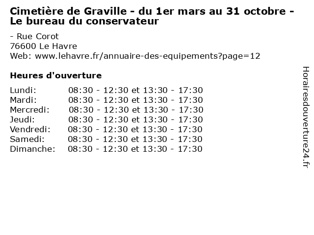 1 Cimetière de Graville - du 1er mars au 31 octobre (Distance: 0,00 km) - Rue Corot, 76600 Le Havre 1er, 31, arbre, au, cimetiere, cimetière, de, du, espace vert, forêt, funeraire, graville, jardin, loisirs, mars, nature, octobre, parc, prairie, square 2 Abbaye de Graville - Du 1er avril au 31 octobre (Distance: 0,14 km) - Rue de l'Abbaye, 76600 Le Havre 1er, 31, abbaye, arbre, au, avril, cimetiere, de, du, espace vert, forêt, funeraire, graville, jardin, loisirs, nature, octobre, parc, prairie, square 3 Abbaye de Graville - Du 1er novembre au 31 mars (Distance: 0,14 km) - Rue de l'Abbaye, 76600 Le Havre 1er, 31, abbaye, arbre, au, cimetiere, de, du, espace vert, forêt, funeraire, graville, jardin, loisirs, mars, nature, novembre, parc, prairie, square 4 Cimetière de Rouelles - du 1er mars au 31 octobre (Distance: 2,72 km) 2 Chemin vicinal, 76610 Le Havre 1er, 31, arbre, au, cimetiere, cimetière, de, du, espace vert, forêt, funeraire, jardin, loisirs, mars, nature, octobre, parc, prairie, rouelles, square 5 Cimetière Nord - du 1er mars au 31 octobre (Distance: 2,97 km) 76 Rue des Sports, 76620 Le Havre 1er, 31, arbre, au, cimetiere, cimetière, du, espace vert, forêt, funeraire, jardin, loisirs, mars, nature, nord, octobre, parc, prairie, square 6 Cimetière Sainte-Marie - du 1er mars au 31 octobre (Distance: 3,03 km) 2 Rue Eugène Landoas, 76620 Le Havre 1er, 31, arbre, au, cimetiere, cimetière, du, espace vert, forêt, funeraire, jardin, loisirs, marie, mars, nature, octobre, parc, prairie, sainte, square |