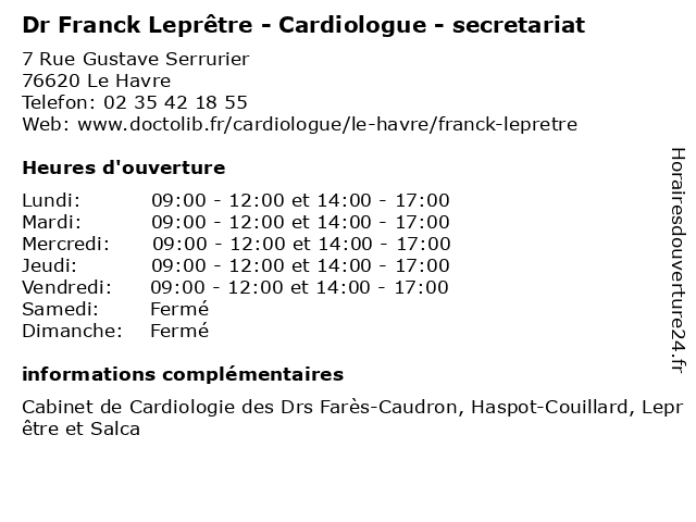 1 Dr Jeannette Farès-Caudron - Cardiologue - secretariat (Distance: 0,00 km) 7 Rue Gustave Serrurier, 76620 Le Havre cardiologue, caudron, dr, fares, farès, jeannette, médecin, médecine, médical, pharmaceutique, secretariat, sectretariat, traitement 2 Dr Isabelle Haspot-Couillard - Cardiologue - secretariat (Distance: 0,00 km) 7 Rue Gustave Serrurier, 76620 Le Havre cardiologue, couillard, dr, haspot, isabelle, médecin, médecine, médical, pharmaceutique, secretariat, sectretariat, traitement 3 Medecin Walid Elgohary (Cardiologue) (Distance: 0,68 km) 505 Irene Joliot Curie, 76620 Le Havre cardiologue, docteur, elgohary, medecin, sante, services, walid 4 Franck Peinture et Menuiserie (Distance: 4,73 km) 7 rue Camille Saint-Saëns, 76290 Montivilliers artisan, et, franck, menuiserie, peinture, qualifications, travaux intérieur et extérieur 5 Dr Franck Lepretre - Cardiologue (Distance: 5,36 km) 29 Av.enue Pierre Mendès France, 76290 Montivilliers cardio, cardiologie, cardiologue, centre, coeur, dr, franck, havre, hospitalier, hôpital, jacques, le, lepretre, monod, montivilliers 6 |