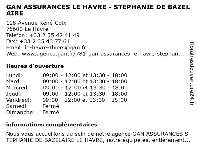 1 GAN ASSURANCES LE HAVRE - CHAPUIS TARTARIN (Distance: 0,64 km) 40 Place Pierre Courant, 76600 Le Havre assurances, chapuis, gan, havre, le, tartarin 2 GAN ASSURANCES LE HAVRE- GREGOIRE LIHOREAU (Distance: 0,66 km) 120 Rue du Maréchal Joffre, 76600 Le Havre assurances, gan, gregoire, havre, le, lihoreau 3 GAN ASSURANCES LE HAVRE MARITIME - A. BOUILLARD & Q. BOIDIN (Distance: 0,79 km) 7 Rue Jules Siegfried, 76600 Le Havre a., assurances, boidin, bouillard, gan, havre, le, maritime, q. 4 Generali Assurances (Distance: 0,86 km) 49 Place de l'Hôtel de ville, 76600 Le Havre assurances, generali, services 5 GAN ASSURANCES LE HAVRE FOCH - F. NOEL & S. KNOP (Distance: 0,89 km) 41 Place de l'Hôtel de Ville, 76600 Le Havre assurances, f., foch, gan, havre, knop, le, noel, s. 6 GAN ASSURANCES LE HAVRE GAMBETTA (Distance: 1,09 km) 67 Rue Bernardin de Saint-Pierre, 76600 Le Havre assurances, gambetta, gan, havre, le |