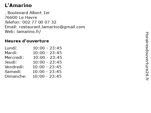 1 L'Amarino (Distance: 0,39 km) n/a Boulevard Albert 1er, 76600 Le Havre bar à cocktails, glaces artisanales, l'amarino, restaurant italien 2 L'Amarino (Mars à Septembre) (Distance: 0,39 km) - Boulevard Albert 1er, 76000 Le Havre bar, l'amarino, lounge, mars, restaurant, septembre 3 La Tablée (Distance: 0,20 km) 69 Rue Guillemard, 76600 Le Havre français, gastronomique, la, restaurant, tablée, traditionnel 4 Il Roméo (Distance: 0,38 km) 48 Rue Champlain, 76600 Le Havre brasserie, café, il, restaurants, restauration, romeo, roméo, traditionnel 5 Al Dente (Distance: 1,30 km) 41-43 Rue Racine, 76600 Le Havre al, dente, restaurant italien traditionnel 6 Restaurant Le Funiculaire (Distance: 1,49 km) 80 rue du Maréchal Gallieni, 76600 Le Havre bistrot, burger, café, funiculaire, le, restaurant, traditionnel |
