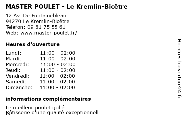 Termes de recherche pour MASTER POULET - Le Kremlin-Bicêtre:le, restaurants, master, fast-food, poulet, bicêtre, kremlin, service de livraison de restaurant, restaurant de grillades |