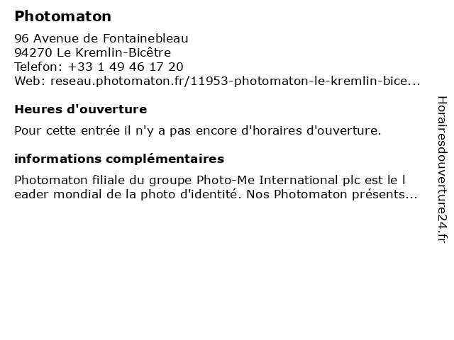 4 Photomaton (Distance: 1,26 km) 98 Boulevard Masséna, 75013 Paris beaute, cafe, chaussures, enfants, lingerie, mode femmes, mode hommes, photomaton, restaurant, sport 5 Photomaton (Distance: 1,43 km) 67/69 Route Nationale 7, 94800 Villejuif beaute, cafe, chaussures, enfants, hommes, lingerie, mode femmes, photomaton, restaurant, sport 6 |
