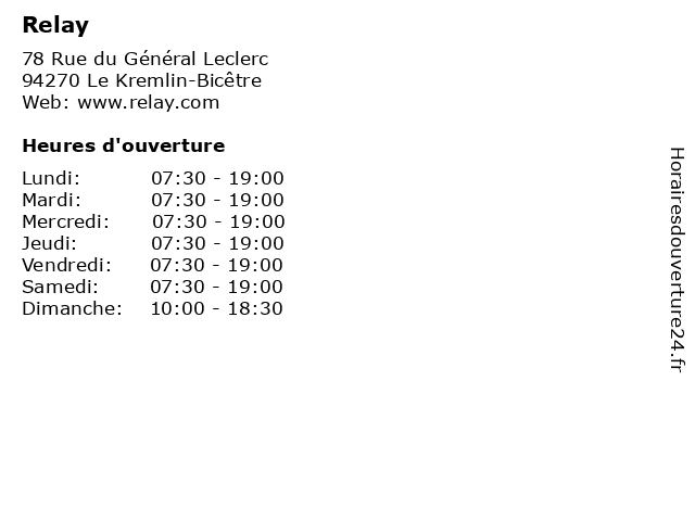 1 Relay (Distance: 0,00 km) 78 Rue du General Leclerc, 94270 Le Kremlin Bicetre beverages, food, gifts, paper, printing, relay, service products, telephone 2 Relay (Distance: 2,26 km) n/a Bagneux, 94230 Cachan beverages, food, gifts, paper, printing, relay, service products, telephone 3 Relay (Distance: 2,39 km) n/a Porte D'Orleans, 75014 Paris beverages, food, gifts, paper, printing, relay, service products, telephone 4 Relay (Distance: 3,71 km) 7 Boulevard de l'Hôpital, 75013 Paris cafe, chaussures, enfants, homme, lingerie, mode femme, relay, restaurant, service 5 Relay (Distance: 4,26 km) 17 Boulevard de Vaugirard, 75741 Paris cafe, chaussures, enfants, homme, mode femme, relay, restaurant, service, sport 6 Relay (Distance: 5,17 km) 191 Rue de la Convention,, 75015 Paris beverages, books in original, e-readers, ebooks, food, large format books, pocket books, printing, relay, service products, variety of kiosk articles |