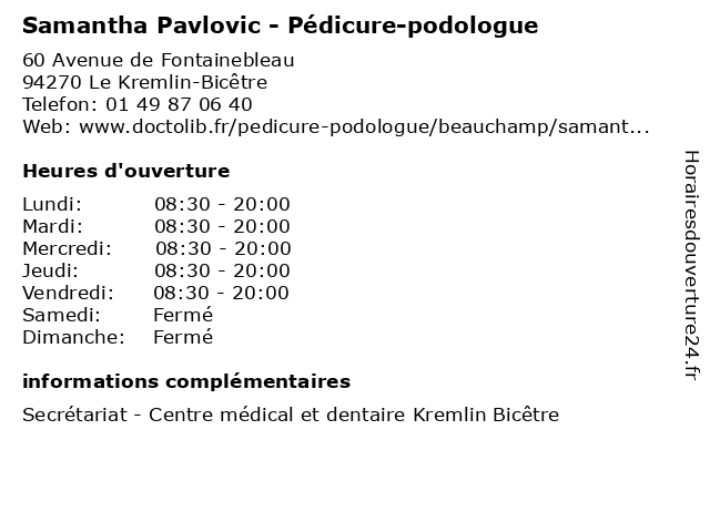 1 Mickael Djian - Pédicure-podologue (Distance: 0,00 km) 60 Avenue de Fontainebleau, 94270 Le Kremlin-Bicêtre djian, mickael, médecin, médecine, médical, pharmaceutique, podologue, pédicure, traitement 2 Elsa settbon - Pédicure-Podologue (Distance: 0,00 km) 60 Avenue de Fontainebleau, 94270 Le Kremlin-Bicêtre 94270, bicêtre, centre, dentaire, elsa, kremlin, médical, podologue, pédicure, settbon 3 Pierre Lomne - Pédicure-podologue (Distance: 1,33 km) 10 Rue Frères d'Astier de la Vigerie, 75013 Paris care, clinic, dentist, france, gynécologue, health, kinesitherapeute, lomne, ophtalmologiste, orl, ostéopathe, pierre, podologue, psychologue, pédicure, service 4 Nacim Benhamma - Pédicure-podologue (Distance: 1,85 km) 44 Rue Charles Moureu, 75013 Paris benhamma, médecin, médecine, médical, nacim, pharmaceutique, podologue, pédicure, traitement 5 Alexandre Musso - Pédicure-podologue (Distance: 1,85 km) 44 Rue Charles Moureu, 75013 Paris alexandre, musso, médecin, médecine, médical, pharmaceutique, podologue, pédicure, traitement 6 Léa Litaize - Pédicure-podologue (Distance: 2,39 km) 74 Rue Dunois, 75013 Paris lea, litaize, léa, médecin, médecine, médical, pharmaceutique, podologue, pédicure, secretariat, traitement |