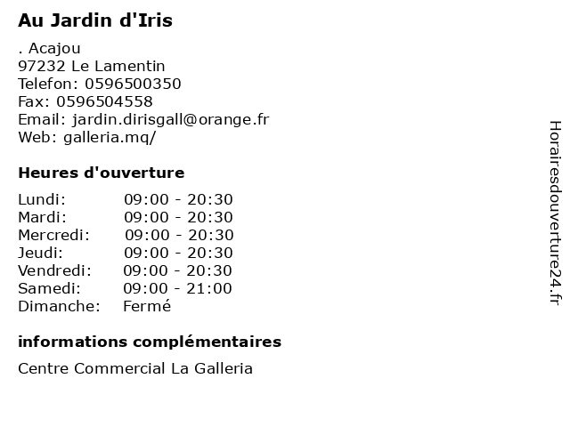 1 Au Jardin d’Iris Galleria (Distance: 2,81 km) . Quartier Acajou, 97232 Le Lamentin au, cadeaux, d’iris, décoration, fleuriste, fleurs, galleria, iris, jardin, plantes 2 Le Jardin des Envies (Distance: 10,43 km) village Poterie, 97229 Trois ilets (les) des, envies, jardin, le 4 La Halle (Distance: 0,00 km) . Acajou, 97232 Le Lamentin cafe, chaussures, enfants, halle, homme, la, lingerie, mode femme, restaurant, service 5 Go Sport (Distance: 0,00 km) . Acajou, 97232 Le Lamentin cafe, chaussures, enfants, go, homme, lingerie, mode femme, restaurant, service, sport 6 Galeries Lafayette (Distance: 0,00 km) . Acajou, 97232 Le Lamentin cafe, chaussures, enfants, galeries, homme, lafayette, lingerie, mode femme, restaurant, service |