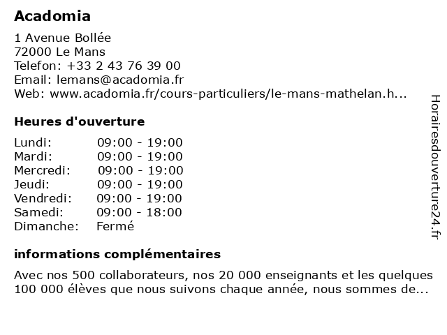 1 Acadomia (Distance: 0,00 km)1 Avenue Bollée, 72100 Le Mans acadomia