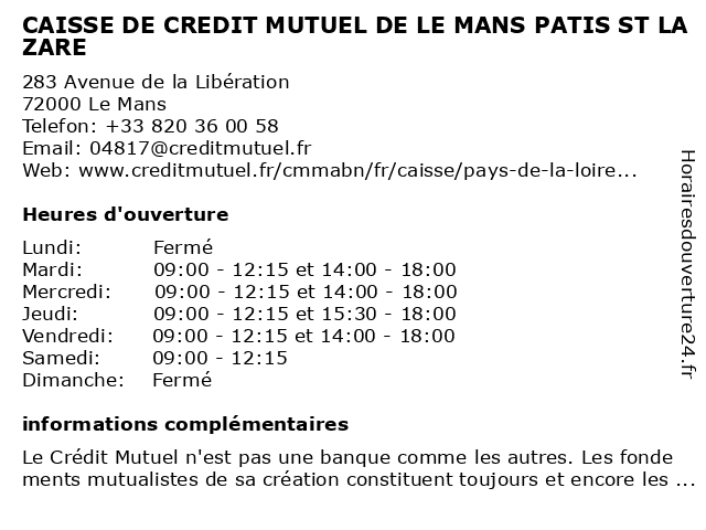 Termes de recherche pour CAISSE DE CREDIT MUTUEL DE LE MANS PATIS ST LAZARE:le, de, st, mans, lazare, crédit, mutuel, caisse, pâtis |