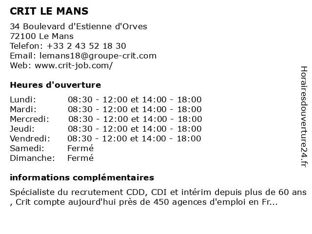 1 CRIT SABLE SUR SARTHE (Distance: 40,52 km) 102 Rue Jules Vernes, 72300 Sablé-sur-Sarthe crit, sable, sarthe, sur 2 CRIT LA FERTE BERNARD (Distance: 40,81 km) 3 Place Victor Hugo, 72400 La Ferté-Bernard bernard, crit, ferte, la |