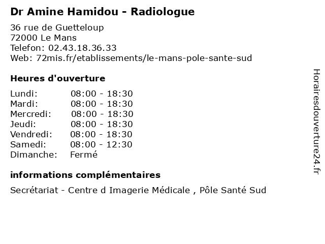 1 Dr Amine Hamidou - Radiologue (Distance: 2,10 km) 72 Avenue Félix Géneslay, 72100 Le Mans amine, consultation, docteur, dr, hamidou, med, médecin, radiologue, traitement 2 Dr Amine Hamidou - Radiologue (Distance: 36,77 km) 43 Rue de la Dauversière, 72200 La Flèche amine, consultation, docteur, dr, hamidou, med, médecin, médecine, radiologue, traitement 3 Dr Amine Hamidou - Radiologue (Distance: 38,51 km) - La Chasse du Point du Jour, 72200 Le Bailleul amine, consultation, docteur, dr, hamidou, med, médecin, médecine, radiologue, traitement 4 Dr Amine Hamidou - Radiologue (Distance: 43,00 km) 1 rue François Truffaut, 72300 Sablé-sur-Sarthe amine, consultation, docteur, dr, hamidou, med, médecin, médecine, radiologue, traitement 5 Dr Nasr Dine Fethy Benchaib - Radiologue (Distance: 0,00 km) 36 rue de Guetteloup, 72000 Le Mans benchaib, consultation, dine, docteur, dr, fethy, med, médecin, médecine, nasr, radiologue, traitement 6 Dr Karine Bornet - Radiologue (Distance: 0,00 km) 36 rue de Guetteloup, 72000 Le Mans bornet, consultation, docteur, dr, karine, med, médecin, médecine, radiologue, traitement |