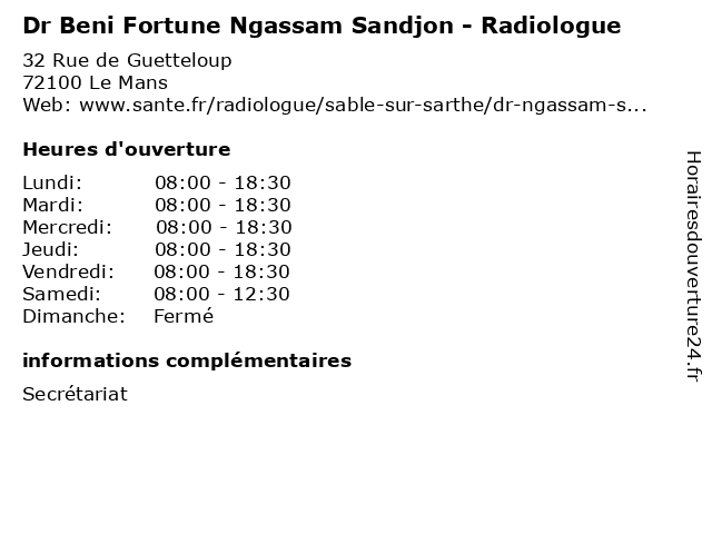1 Dr Beni Fortune Ngassam Sandjon - Radiologue (Distance: 4,84 km) 7 Avenue Pierre Mendès France, 72000 Le Mans beni, consultation, docteur, dr, fortune, med, médecin, ngassam, radiologue, sandjon, traitement 2 Dr Hassan Aboudeeb - Radiologue (Distance: 0,00 km) 32 Rue de Guetteloup, 72100 Le Mans aboudeeb, diagnostique, dr, hassan, imagerie, radiologie, radiologue, thérapeutique 3 Dr François Plassart - Radiologue (Distance: 0,00 km) 32 Rue de Guetteloup, 72100 Le Mans diagnostique, dr, francois, françois, imagerie, plassart, radiologie, radiologue, thérapeutique 4 Dr Odile Alami - Radiologue (Distance: 6,27 km) 194 avenue Rubillard, 72037 Le Mans alami, centre, diagnostique, dr, hospitalier, imagerie, le, mans, odile, radiologie, radiologue, thérapeutique 5 Dr Francesco Cinquantini - Radiologue (Distance: 6,27 km) 194 avenue Rubillard, 72037 Le Mans centre, cinquantini, diagnostique, dr, francesco, hospitalier, imagerie, le, mans, radiologie, radiologue, thérapeutique 6 Dr Anne-Charlotte Collart - Radiologue (Distance: 6,27 km) 194 avenue Rubillard, 72037 Le Mans anne, centre, charlotte, collart, diagnostique, dr, hospitalier, imagerie, le, mans, radiologie, radiologue, thérapeutique |