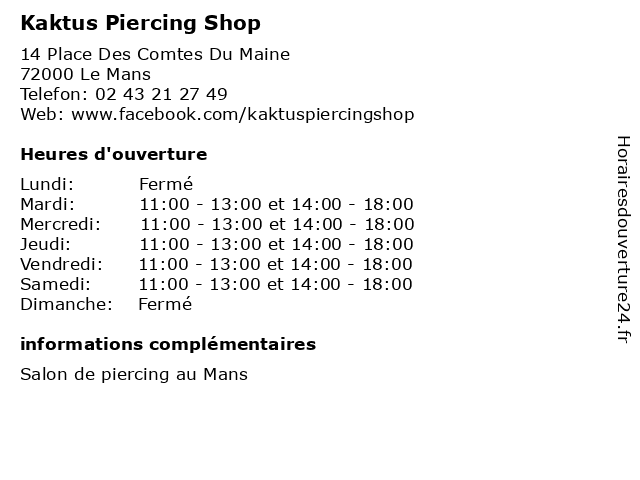| Samedi | 11:00-13:00 et 14:00-18:00 |