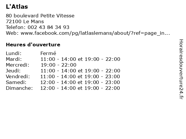 | Dimanche | 12:00-14:00 et 19:00-22:00 |
