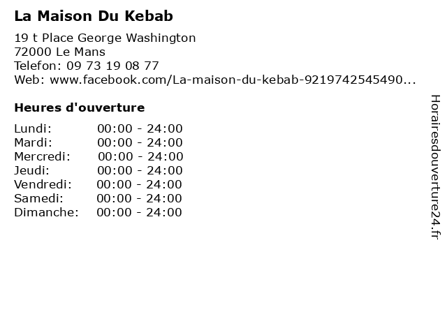 1 Jack's Kebab (Distance: 0,03 km) 16 place George Washington, 72000 Le Mans boissons, frites, halal, jack's, kebab, restaurant 2 Kebab Le Diamant Vert (Distance: 0,67 km) 7 Avenue Du General Leclerc, 72000 Le Mans bar, bistro, bistrot, brasserie, café, diamant, kebab, le, pub, restaurant, restauration, resto, turc, vert 3 Mac' Doner Kebab (Distance: 0,70 km) 29 Boulevard Robert Jarry, 72000 Le Mans bar, bistro, bistrot, brasserie, café, doner, kebab, mac', pub, restaurant, restauration, resto, turc 4 King Kebab (Distance: 0,98 km) 5 Rue du Port, 72000 Le Mans kebab, king, restaurant, restauration, turc 5 Le Royal Kebab (Distance: 2,21 km) 7 Place Edouard De La Boussinière, 72000 Le Mans collations, hamed, kebab, le, milali, restaurants, royal 6 Kouika Kebab (Distance: 2,83 km) 375 Avenue Félix Geneslay, 72000 Le Mans boissons, kebab, kebabs, kouika, restaurant |