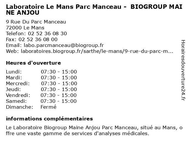 Termes de recherche pour Laboratoire Le Mans Parc Manceau - BIOGROUP MAINE ANJOU:le, mans, laboratoire, anjou, parc, maine, manceau, biogroup, dépistages, laboratoire de diagnostic |