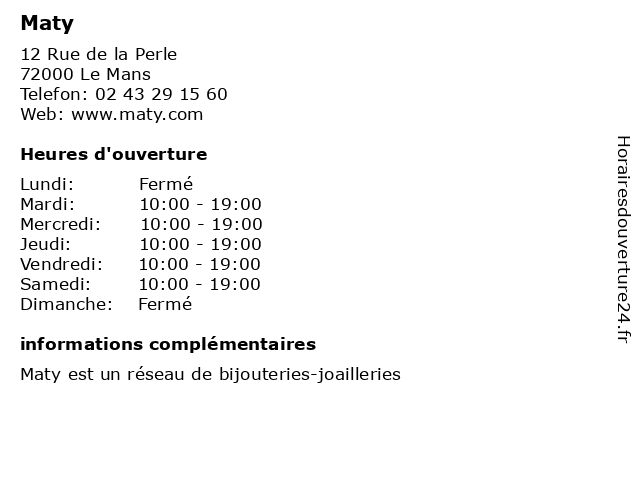 1 Madame. (Distance: 0,02 km) 6 Rue de Paris, 72000 Le Mans accessoires, boutique, femme, madame., mode, vêtements 2 Maison 123 (Distance: 0,03 km) 10 rue de la Perle, 72000 Le Mans 123, accessoires, chaussures, maison, maroquinerie, mode, prêt-à-porter, vêtements 3 Clip's Bijoux (Distance: 0,03 km) 3 rue Saint Martin, 72000 Le Mans bijouterie, bijoux, bracelets, clip's, horlogerie 4 Armand Thiery Femme (Distance: 0,04 km) 1 Rue de Paris, 72000 Le Mans accessoires, armand, caleçons, femme, jeans, jupes, mode, thiery, vêtements 5 Armand Thiery Homme (Distance: 0,04 km) 11 Rue Saint Jacques, 72000 Le Mans accessoires, armand, costume, homme, mode, slips, thiery, vêtements 6 Catimini (Distance: 0,04 km) 12 rue Saint Jacques, 72000 Le Mans accessoires, catimini, enfants, filles, garçons, habillement, mode, pret à porter, vêtements |