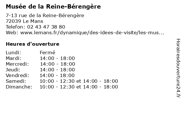 | Dimanche | 10:00-12:30 et 14:00-18:00 |