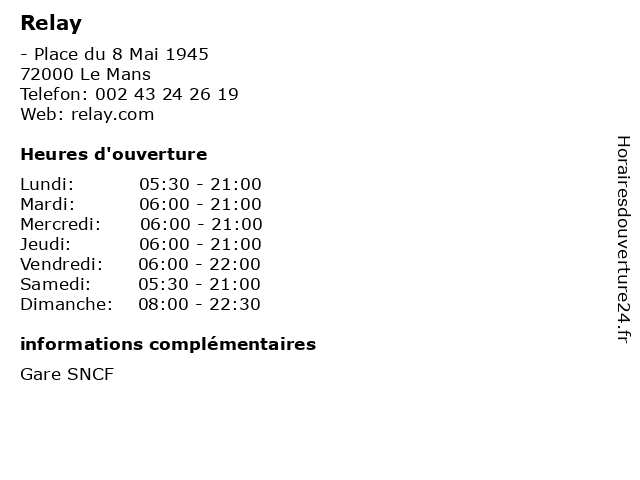 1 Relay (Distance: 3,13 km) n/a Gare, 33120 Arcachon beverages, food, gifts, paper, printing, relay, service products, telephone 2 Relay (Distance: 7,40 km) n/a Place de la Gare, 72000 Le Mans beverages, food, gifts, paper, printing, relay, service products, telephone 3 Bar-Tabac El Brazza (Distance: 0,66 km) 62 Rue Nationale, 72100 Le Mans bar, brazza, café, el, fdj, journaux, presse, tabac 4 Bar-Tabac Le Maine (Distance: 0,71 km) 2 avenue du Général Leclerc, 72000 Le Mans bar, café, fdj, journaux, le, maine, presse, tabac 5 Tabac Le Maryland (Distance: 2,02 km) 8 Place Adrien Tironneau, 72100 Le Mans bar, café, fdj, journaux, le, maryland, presse, tabac 6 Boulangerie Feuillette (Distance: 2,83 km) 1 rue Pierre Martin, 72100 Le Mans artisans, boulangerie, boutique, feuillette, pains, snack, viennoiseries |