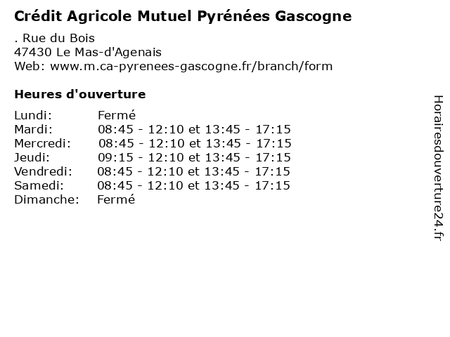 1 Crédit Agricole Mutuel Pyrénées Gascogne (Distance: 7,71 km) . Place Jean-Jaurès, 47400 Tonneins agricole, assurances, bancaire, banque, crédit, gascogne, mutuel, pyrénées, services 2 Crédit Agricole Mutuel Pyrénées Gascogne (Distance: 9,39 km) . Le Clavier, 47250 Bouglon agricole, assurances, bancaire, banque, crédit, gascogne, mutuel, pyrénées, services 3 Crédit Agricole Mutuel Pyrénées Gascogne (Distance: 14,06 km) 4 Rue Jean-Jaurès, 47320 Clairac agricole, assurances, bancaire, banque, crédit, gascogne, mutuel, pyrénées, services 4 Crédit Agricole Mutuel Pyrénées Gascogne (Distance: 14,38 km) . Boulevard du Midi, 47160 Damazan agricole, assurances, bancaire, banque, crédit, gascogne, mutuel, pyrénées, services 5 Crédit Agricole Mutuel Pyrénées Gascogne (Distance: 14,77 km) . Place de l'Église, 47700 Casteljaloux agricole, assurances, bancaire, banque, crédit, gascogne, mutuel, pyrénées, services 6 Crédit Agricole Mutuel Pyrénées Gascogne (Distance: 16,32 km) . Place Docteur Bellot, 47180 Sainte-Bazeille agricole, assurances, bancaire, banque, crédit, gascogne, mutuel, pyrénées, services |